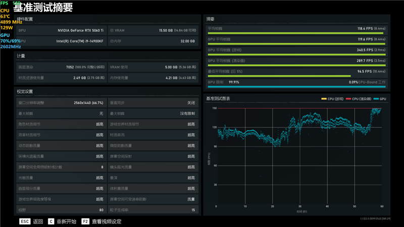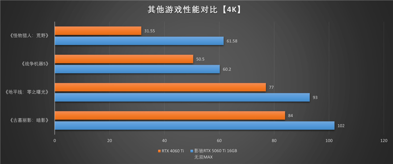 在《戰爭機器5》中,使用超高畫質進行測試,4K分辨率下平均幀率爲60.2,2K分辨率下平均幀率爲118.4。