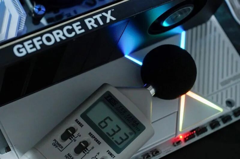 我們使用噪音計測量影馳RTX 5060 Ti無雙MAX顯卡烤機時的渦輪風扇噪音,由於我們是裸機直接運行,所以噪聲計可以直接放在顯卡邊上,並非正常玩家裝機後的效果,僅供參考。