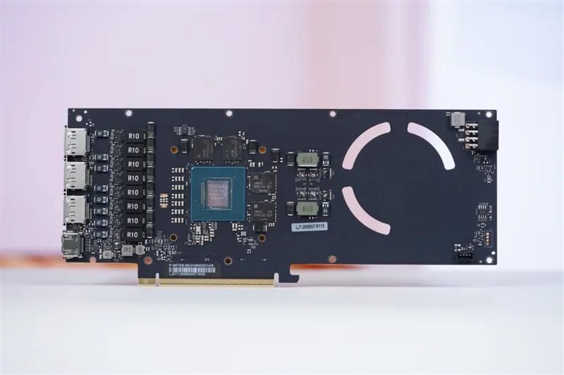 影馳RTX 5060 Ti無雙MAX顯卡的PCB全貌,可以看到由於單槽超薄設計和渦輪風扇的使用,影馳RTX 5060 Ti無雙MAX顯卡的PCB遠比其他RTX 5060 Ti所使用的PCB更大更長,不但給出了渦輪風扇的安裝位置,還把8P外接供電接口延伸到顯卡尾部。