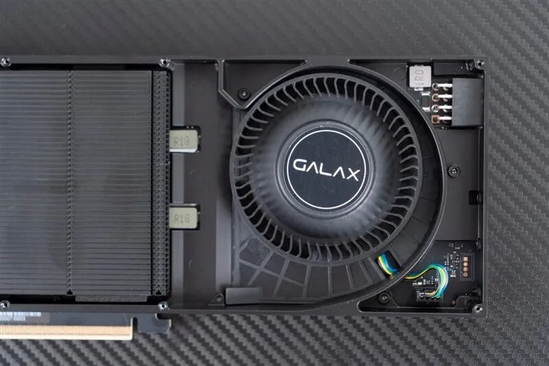 影馳RTX 5060 Ti 無雙MAX顯卡正面全黑設計,非常簡潔,只在顯卡尾部佈置了一個渦輪風扇,顯卡前半部分黑化處理的純銅散熱片直接外露。