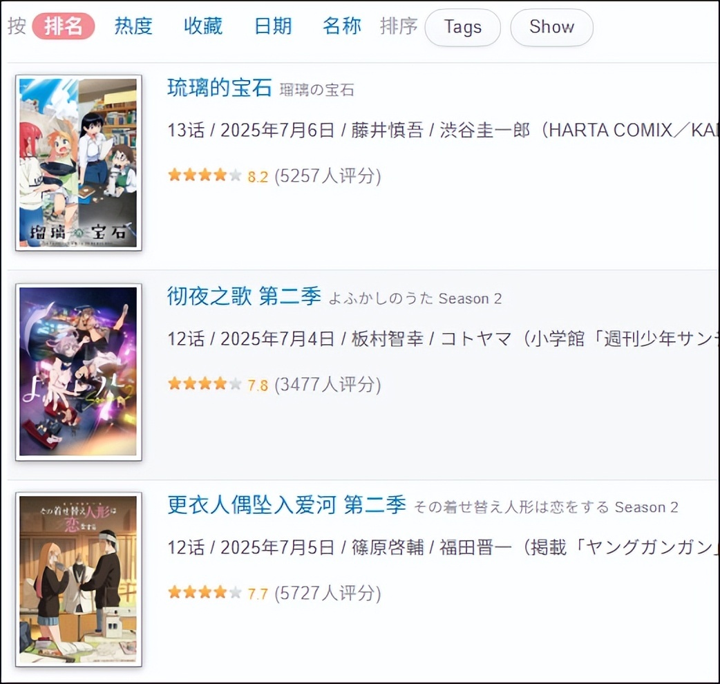 平平无奇、又硬核挑人的原作摆在那,动画开播也就没多留意。但没想到国庆再看,《琉璃的宝石》已经成为Bangumi 7月评分最高的动画,力压好评如潮的《更衣人偶》与我非常喜欢的《彻夜之歌》。