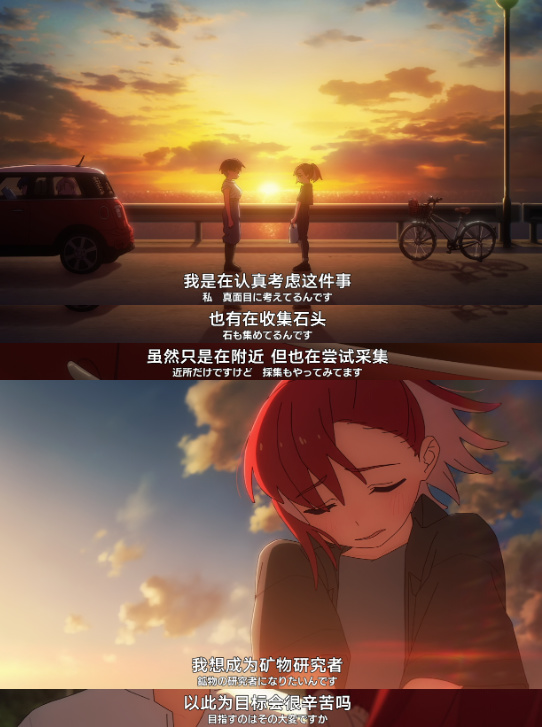 这一集从硝子的视角切入,从小她就对闪闪发光的矿物感兴趣,但这种爱好在同辈间显得格格不入,教育者的漠视,长辈的不支持让她一度丧气,将喜欢的矿石放在上锁的抽屉里,封闭自己的爱好。