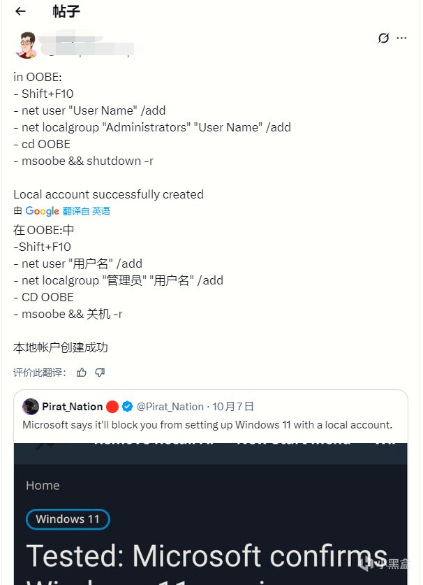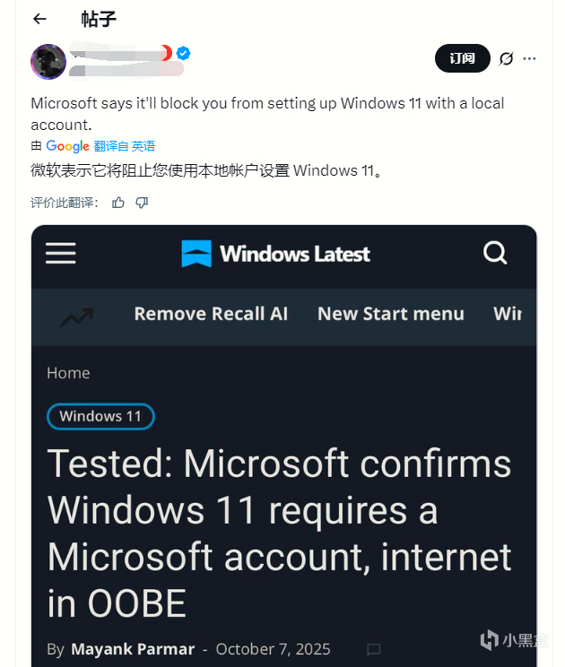 有用户表示微软将阻止使用本地帐户设置 Windows 11