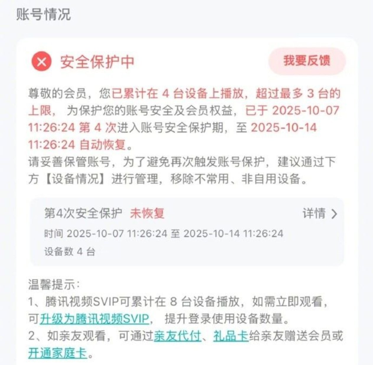 一名网友在社交平台爆料,其腾讯视频VIP账号因累计在4台设备上播放,超出平台规定的3台设备上限,被系统封禁7天。截图显示,该账号已于10月7日进入第4次账号安全保护期,需等到10月14日才能自动恢复。