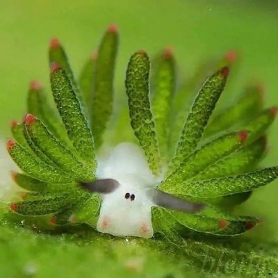 藻类海蛞蝓是海蛞蝓的一种,长相酷似披着树叶的小羊,故又称叶羊,是能够进行光合作用的动物。海蛞蝓是科学家发现的第一种可利用植物色素叶绿素的动物。它的身体软绵绵的、身长也只能长到 5mm,有着毛茸茸的触角、还有无辜的小眼睛,感觉特别萌萌哒。藻类海蛞蝓靠著吃藻类,让叶绿体和自己的体细胞共存。