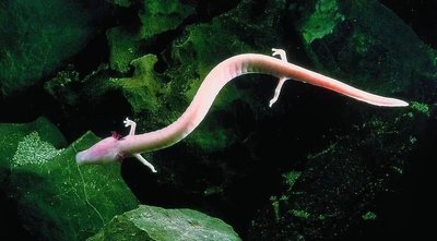 洞螈(亦称盲螈),是一种两栖类动物,是一种终生保持幼体形态的水生蝾螈,身长不到30厘米,但也有部分个体的长度可以达到40厘米,全身呈白色,四肢细小,有发达的外鳃3对和鳃孔2对,羽状鳃红色。头狭小,头骨多软骨质。吻钝,无眼睑,眼退化,隐于皮下,但感光灵敏。终生底栖在地下水形成的暗洞内,时常将鼻孔伸出水面呼吸空气。在光照下肤色可变成黑色,回暗洞后肤色又恢复原状。