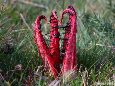 "章鱼鬼笔"是一种菌类蘑菇,长着红色触须,犹如刚从卵状液囊中孵化的外星生物,在"胶状卵阶段",这种菌类红色触须折叠在液囊壁上,之后触须伸展出来,最终能够竖立在地面上生长。章鱼鬼笔原产地是澳大利亚和新西兰,1946年英国康沃尔郡首次发现"章鱼鬼笔",之后出现在其它地区。