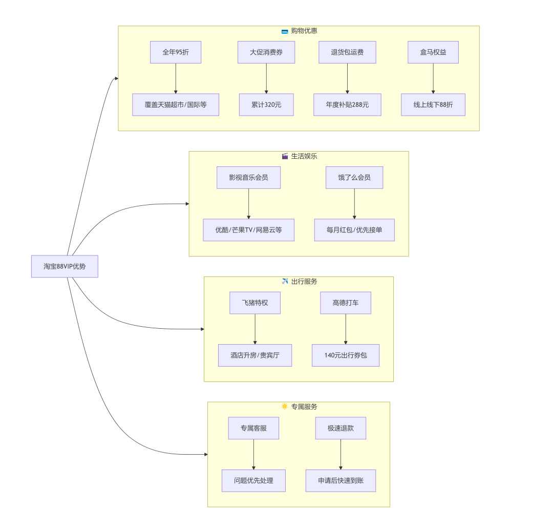 淘寶88VIP優勢:淘氣值1000以上88元開通費用相對較低。開通生活卡可享優酷VIP/芒果TV、夸克VIP年卡、餓了麼喫貨年卡、網易雲黑膠VIP年卡等多重福利,屬於買一得五,性價比高。天貓超市直接95折,優惠感知度高。