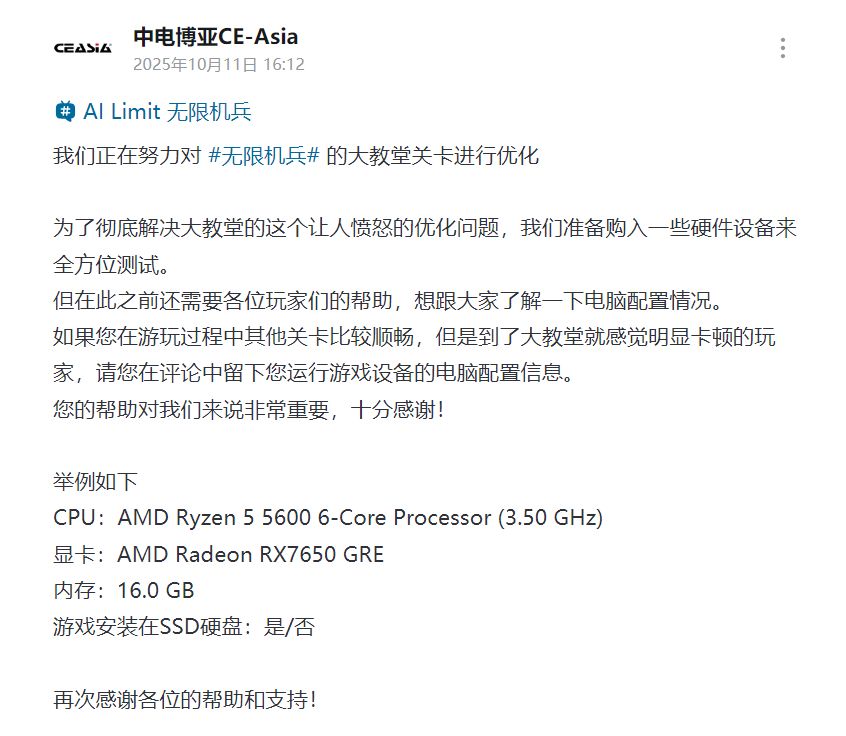 除此之外,官方还想了解玩家们的电脑配置情况,如果到了大教堂就感觉明显卡顿的玩家,可以在B站等官方账号下的评论区里留下相关的电脑配置信息。