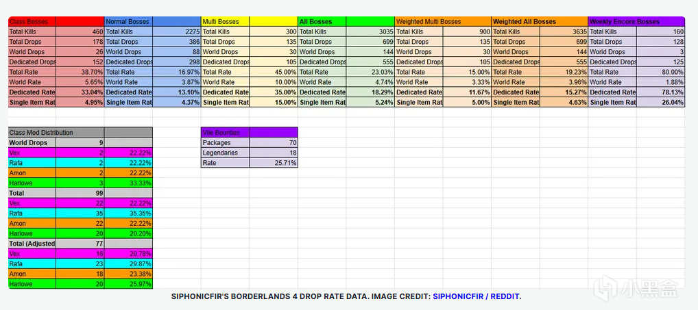 Siphonicfir在Ultimate Vault Hunter Mode 5難度下,使用Vex角色進行測試,排除周常encore boss以避免數據偏差。結果顯示,正常boss的傳奇掉落率約爲1/20,早於社區猜測的1/10至1/15。Siphonicfir表示:“我想知道磨遊戲時到底在對抗什麼概率。”他用手機筆記實時記錄戰利品,事後導入Excel計算,確保樣本從解鎖UVHM5開始收集。