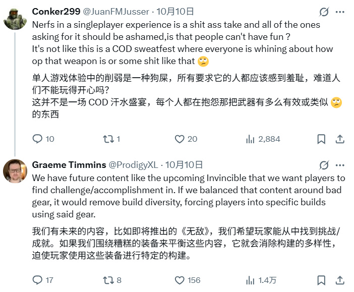 蒂明斯強調未來平衡性改動旨在維持玩法多樣性與挑戰性。針對單人模式下武器與技能削弱的擔憂,他澄清道:"我們規劃瞭如'無敵模式'等未來內容,希望玩家能體驗挑戰與成就感。若以弱勢裝備爲基礎平衡這些內容,將削弱構築多樣性,迫使玩家只能使用特定裝備組合。"