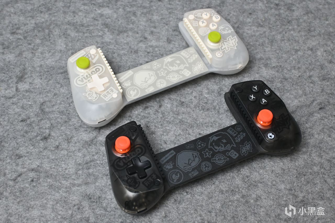 这次的X5s做了磨砂雾透的设计,面壳打磨的手感非常到位,并没有传统塑料那种油腻腻的感觉。整个面壳虽然印满了绝区零的各种元素却不显得杂乱,狠狠给设计师加鸡腿了,这设计真的深得我心。另外,两个配色的摇杆颜色也呼应了外包装的绝区零logo,白色版本为绿色摇杆,黑色版本为橙色摇杆。