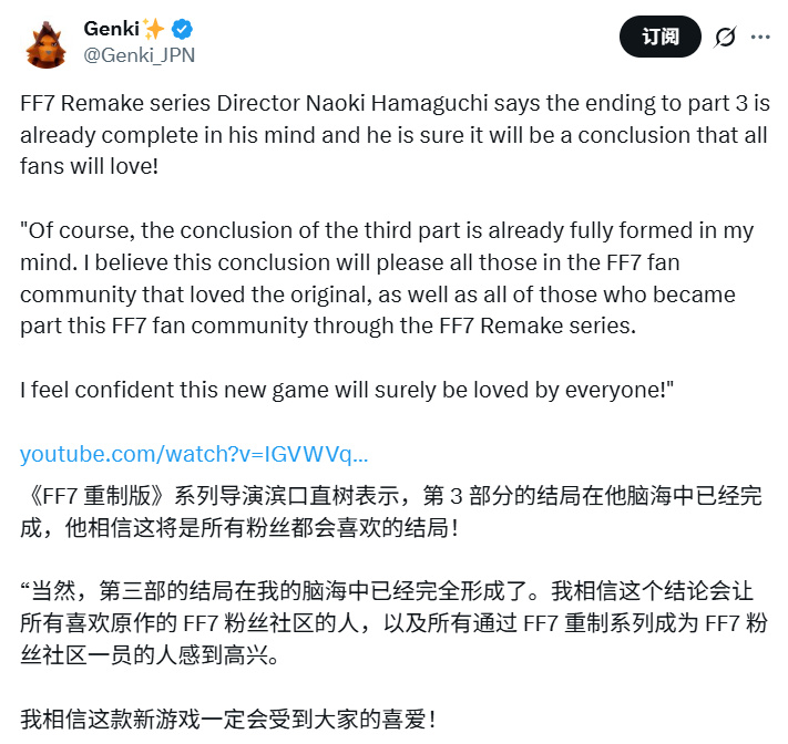 "第三部的结局自然已在我心中完全构筑成型,"浜口表示,"我相信这个结局将取悦所有热爱原版的FF7粉丝群体,以及通过重制系列加入FF7大家庭的新成员。我有信心这款新作必将赢得所有人的喜爱!"