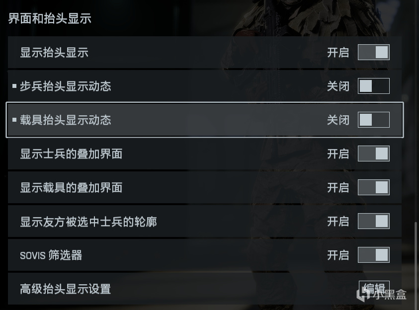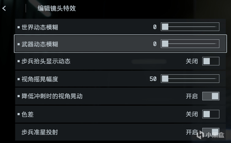 世界动态模糊,武器动态模糊都拉到0,步兵抬头显示动态关闭,视角摇晃幅度拉到最低,这个选项高了,爆炸效果会晃动影响对枪,降低冲刺时的视角晃动开启,冲刺晃动会影响寻找敌人,色差推荐关闭