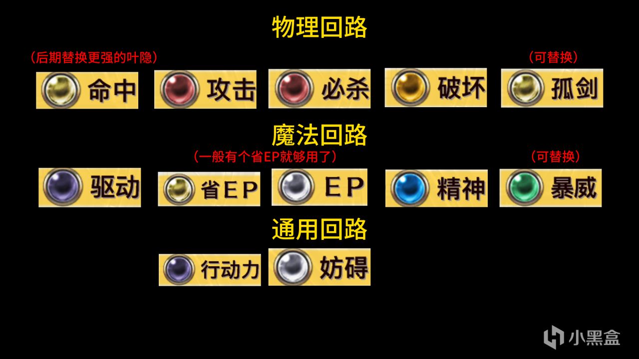 驅動(魔法流必帶回路,雖然不降低魔法的硬直但是能大幅降低驅動(起手)時間)、省EP/EP(一般情況下有個省EP就夠用了)、精神、暴威(不習慣壓殘血可以不用)