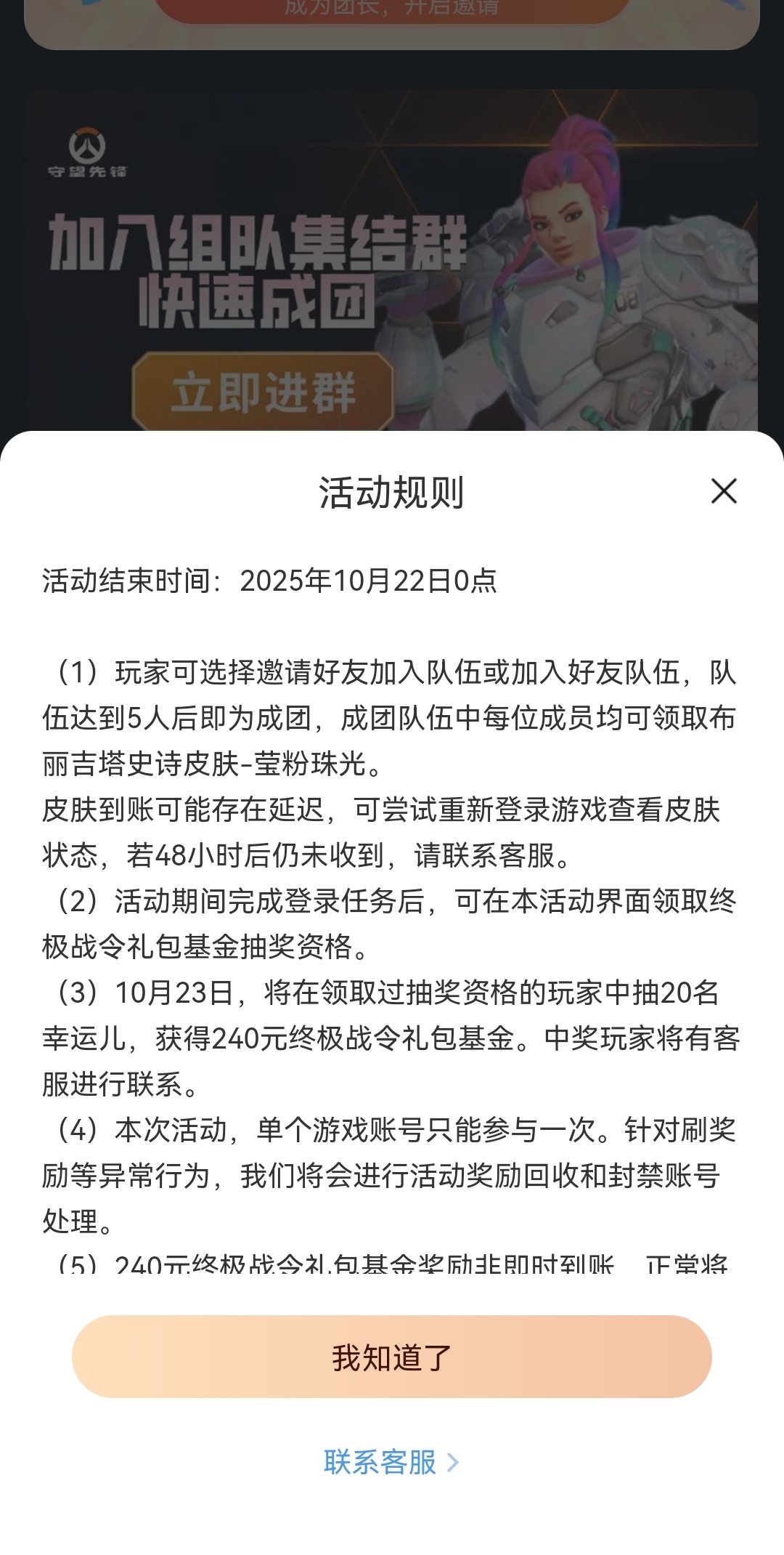 vx小程序,网易超级会员,活动截止时间为10月22号0点。五人组团,成功后每人可领布里吉塔-莹粉珠光史诗皮。登录游戏可获得抽奖券,23号开奖。