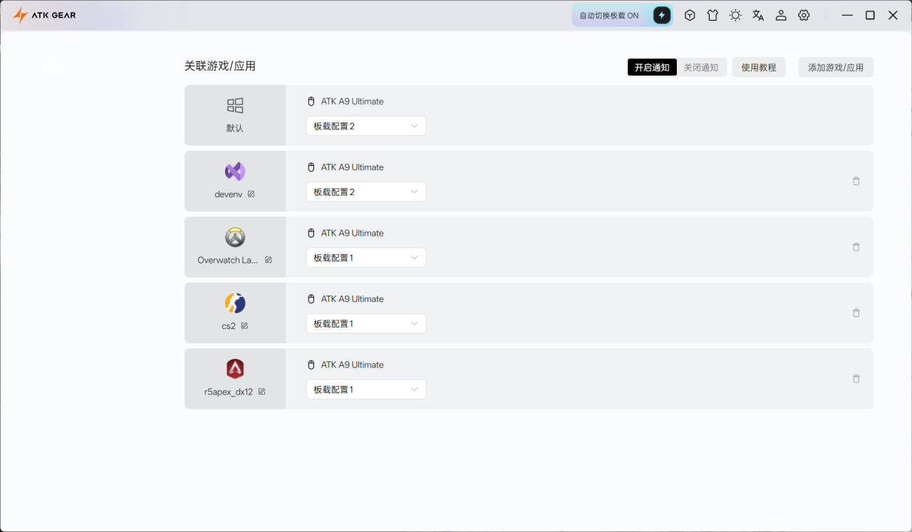這裏需要提醒的是,atk的模式跟隨邏輯是跟隨鼠標焦點窗口,所以最好只綁定全屏和窗口化全屏遊戲,不要爲完全窗口化的應用綁定模式,不然在切換窗口時會頻繁觸發切換默認並在右下角彈提示
