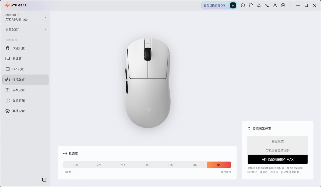 性能設置方面,和雷柏相比沒有那麼多模式,只有傳感器採樣率和回報率可選,支持8k回報率和20000fps+的固件,性能是沒有區別的,但是不會顯示當前模式下的預計續航,這點不如雷柏做的細緻