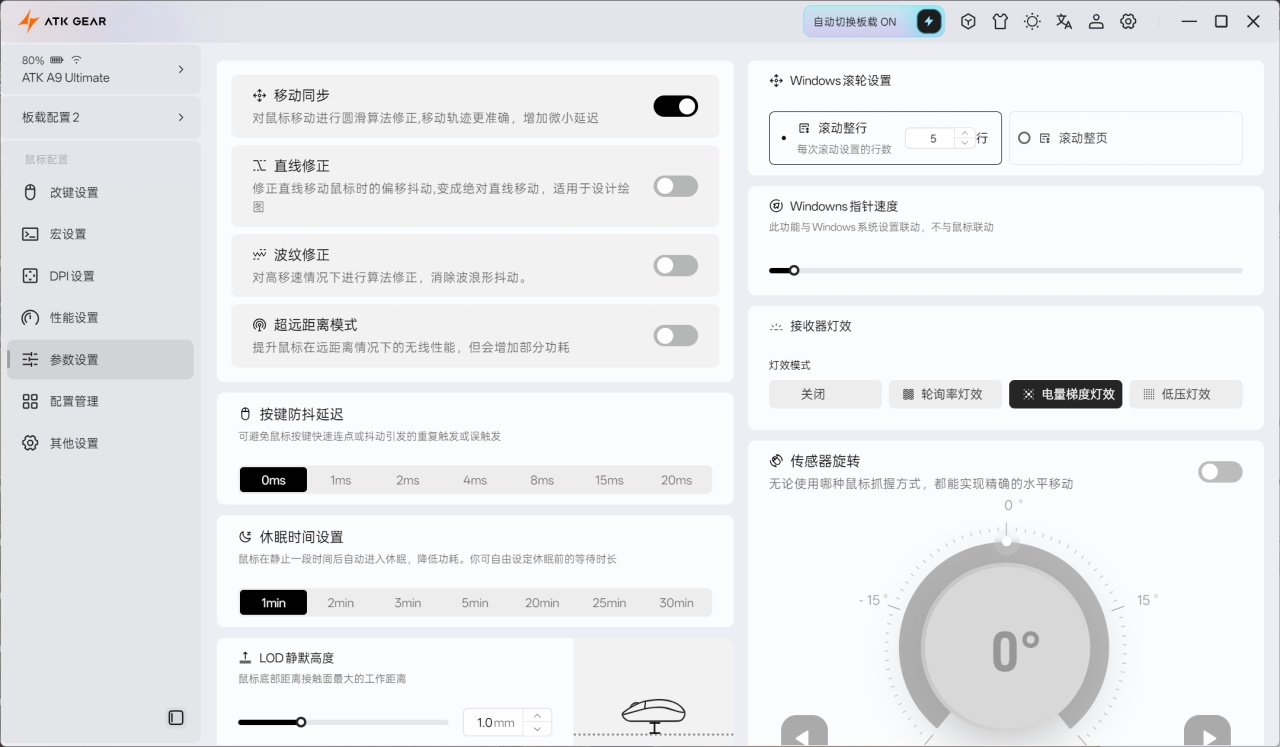 參數設置,支持幾乎所有你能在別的鼠標中能調節的參數,不過缺少了玻璃追蹤模式,不知道在玻璃墊上的表現和支持玻璃追蹤模式的鼠標相比是否有差距