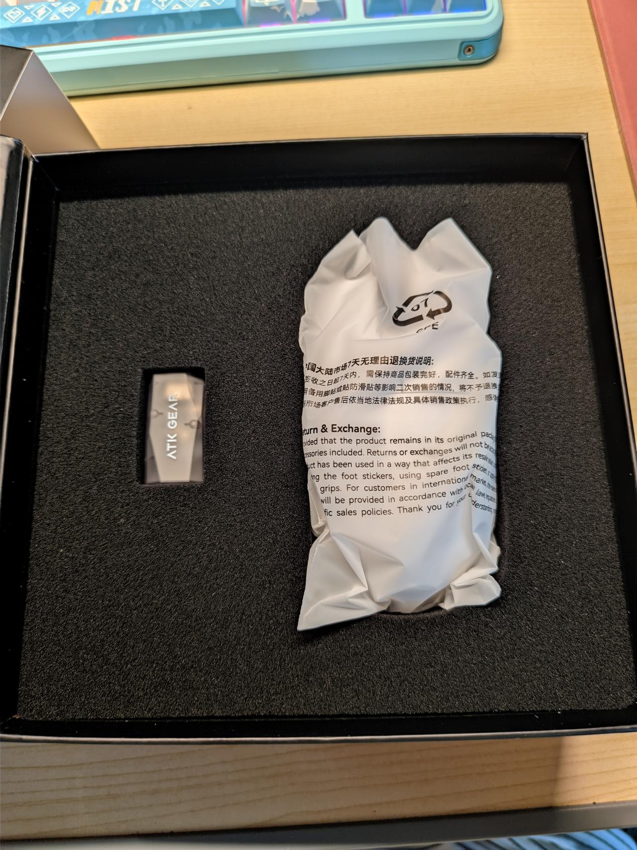 掀开盒盖,第一层是鼠标本体和8k接收器,使用海绵进行限位,比起使用塑型塑料片进行限位,确实更有格调