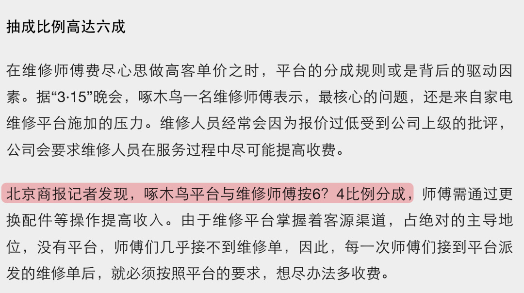 315 曝光的啄木鳥宰客,有一部分原因是平臺抽成高達 60%,師傅老老實實幹活可能養不活自己,但單幹又接不到訂單,所以他們只能想辦法去多收費。
