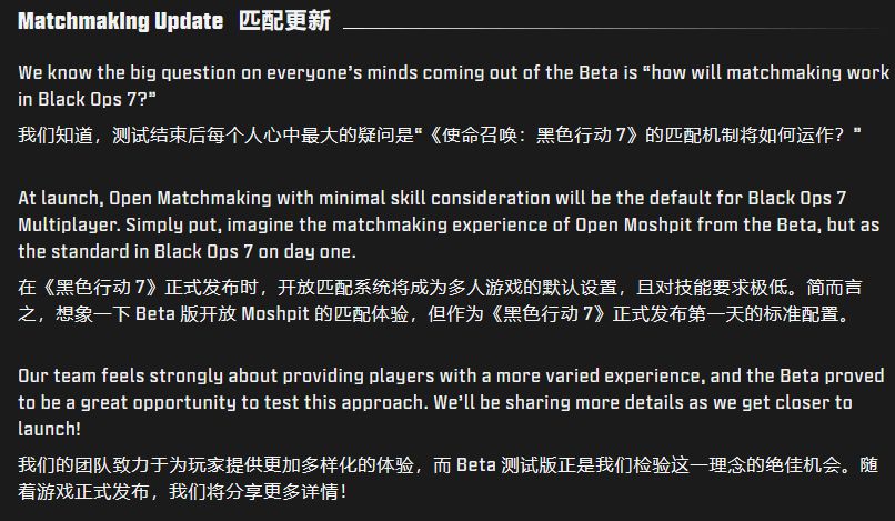 《黑色行動7》將採用類似公測階段“開放大雜燴”(Open Moshpit)的匹配體驗。動視表示,這將作爲遊戲發售時的標準設置。新機制下,匹配過程幾乎不再考慮玩家技能水平,優先創造多樣化的對戰體驗。配合“持久大廳”功能,玩家匹配成功後可以持續與同一批玩家遊戲,除非主動退出或大廳關閉。動視強調,這些變更是基於測試階段的數據和反饋,旨在讓遊戲迴歸更自然、輕鬆的匹配環境。