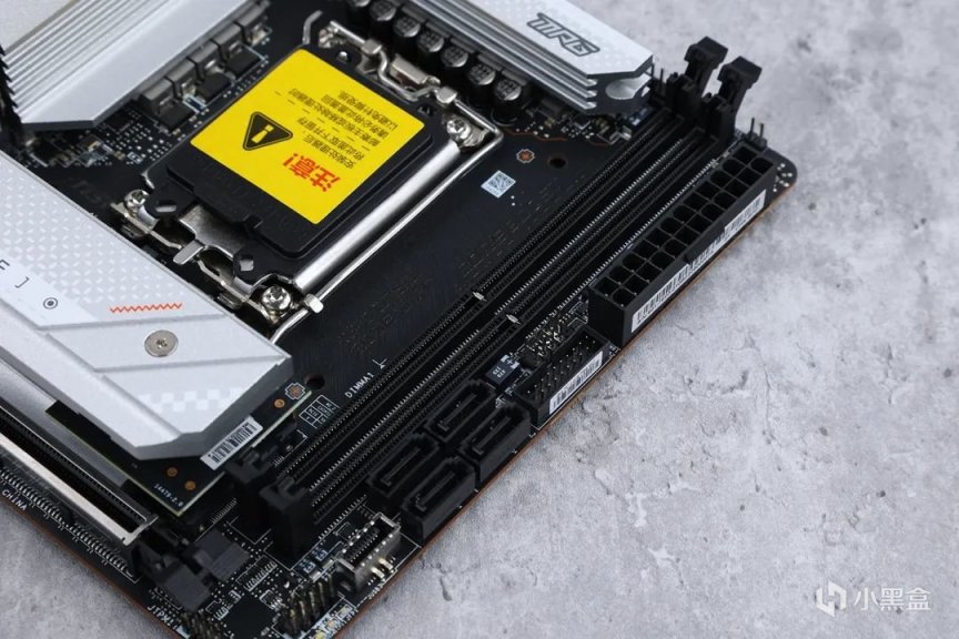 主板提供了一条PCIE X16规格的插槽,该插槽最高支持PCIE 5.0 X16的传输速率,带金属装甲。两条DDR5内存插槽采用了单边卡口设计,最高支持64G的内存容量,以及最高可OC至8000MHz+的内存频率;