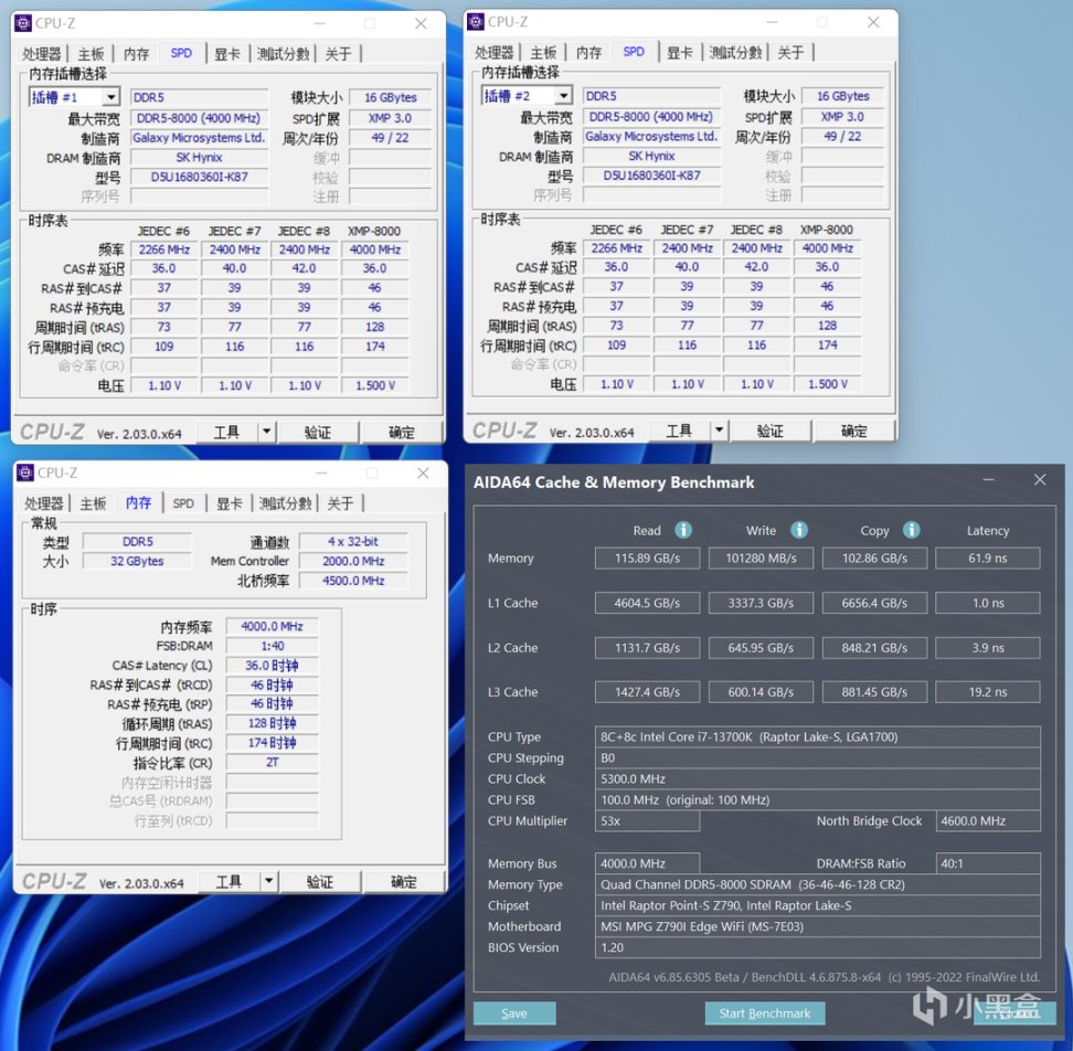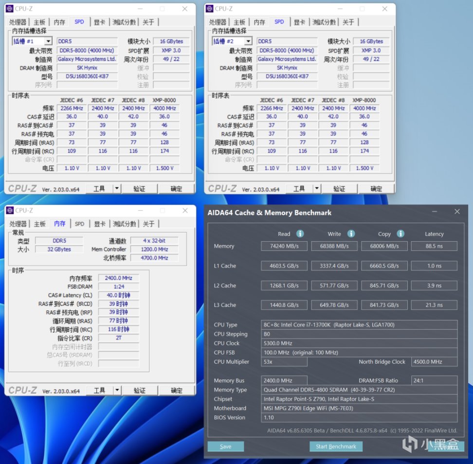 AIDA 64内存读写测试,默频(原生4800MHz)状态下,读取速度为74240 MB/s,写入速度68388 MB/s,复制速度68006 MB/s,延时为88.5 ns。开启内存XMP后,内存读取115.89 GB/s,写入速度为101280 MB/s,102.86 GB/s,延时61.9 ns;