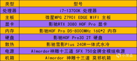 测试平台搭建完整配置:i7-13700K处理器、微星MPG Z790I EDGE WIFI主板、影驰HOF Pro D5-8000MHz 16G*2内存、HOF Pro30 2T硬盘、RTX 3080 HOF Pro显卡、雪影Plus 240R一体式水冷,Almordor神雕十三道 SFX 750金牌全模组电源、莫邪机箱…