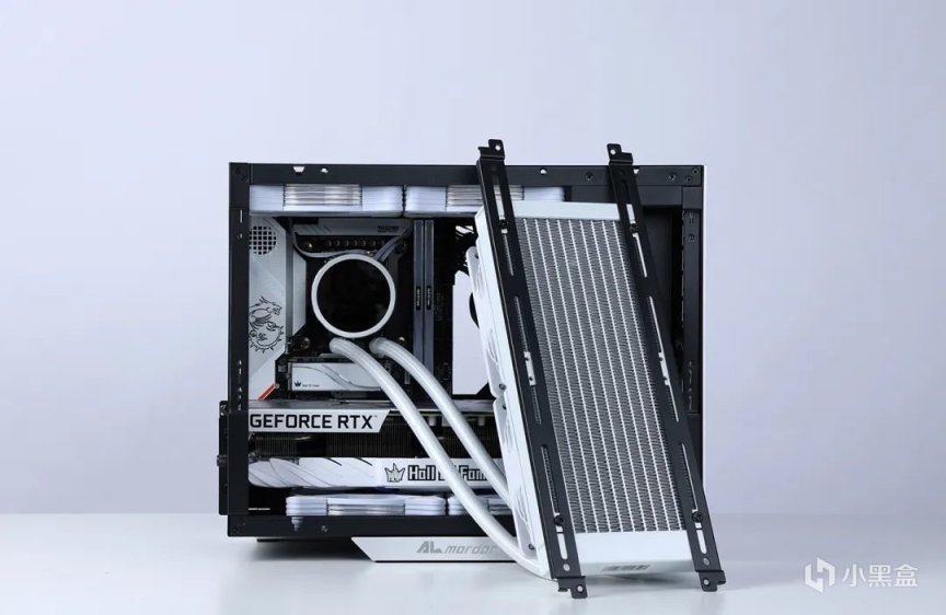 先将散热装上机箱侧面的水冷支架,然后再将水冷支架卡入机箱框架上的开孔;