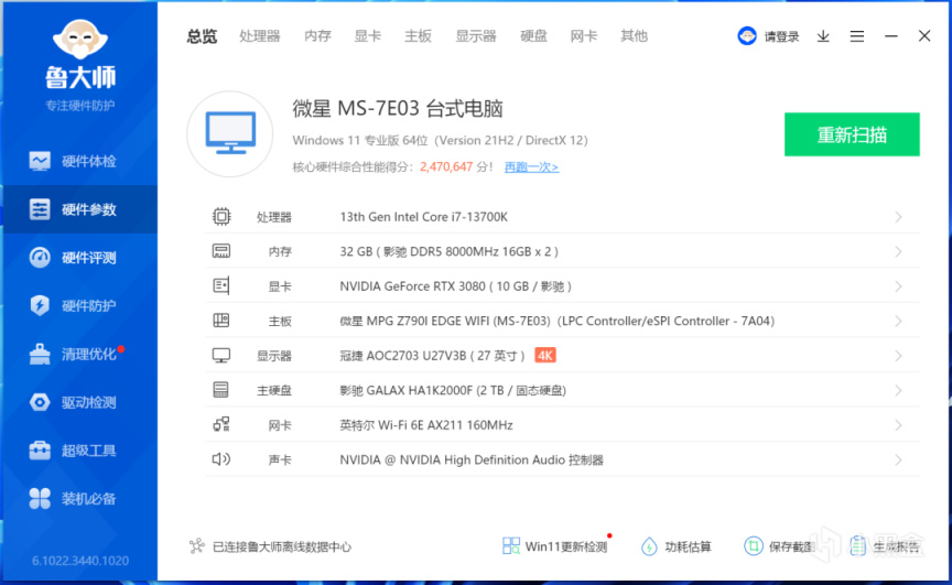 至于显卡,条件有限,只能拿RTX 3080 HOF Pro显卡顶上。纯白外观搭配优秀的性能,信仰直接拉满。爽玩4K 3A大作也问题不大。