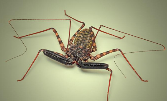 鞭蛛是介乎於蜘蛛和蠍子之間的一個品種,蛛形綱(Arachnida)無鞭目(Amblypygi, 有時作Phrynichida)130種動物的總稱。體長8~45釐米(0.3~1.8吋)。 須肢的邊緣多刺,用於捕食。第3附肢爲長鞭狀觸鬚。外形稍似有鞭蠍(鞭尾蠍),但無尾(鞭節)。鞭蛛是夜行性的,白天隱蔽在木頭、樹皮、石塊和葉下,有的在洞穴中。一般喜潮溼的環境。不叮也不咬,捕食昆蟲和其它節肢動物。卵在雌性腹部下面的囊內孵化爲若蟲,然後攀到母體的背上。