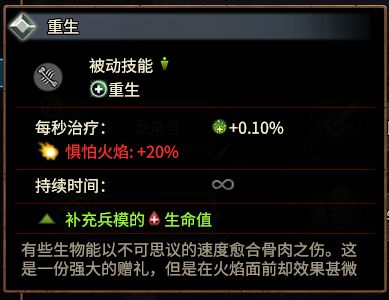 最后,就是火攻能削弱单位的回血速率,你简单理解为回血砍半就行。比如,你本应该1s回血2点,被火焰攻击(火焰法术造成的伤害也算)后变为1s回血1点。而且很多带重生的单位本身有负面效果——惧怕火焰,所以这也是为啥即便火攻要多吃一层火炕,也还是很有必要的,不像锤二的魔攻被人褒贬不一,被诟病需要额外吃魔抗。