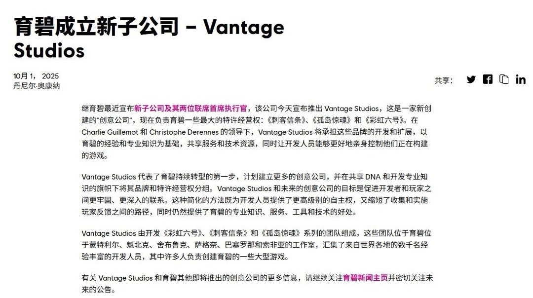 今年3月底,育碧公告表示,腾讯将斥资11.6亿欧元投资这家育碧设立的新子公司、并获得该子公司25%的股权。在获得必要的监管批准后,此次交易预计将于2025年底之前完成。就目前来看这个子公司就是如今的Vantage Studios。