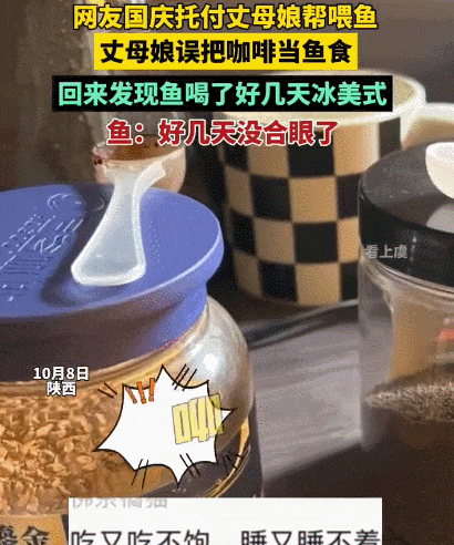 近日,陕西,男子国庆出游托付丈母娘帮喂鱼,回家发现鱼缸的水变成咖色,原来是丈母娘误把咖啡当鱼食,让鱼喝了好几天冰美式。