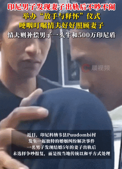 在众人见证下,男子情绪激动,握着情夫肩膀哽咽叮嘱,称已与妻子离婚,将其交予情夫,希望对方好好照顾。情夫则需履行双方事前约定,赠送一头牛,并支付500万印尼盾(约人民币2154.50 元)作为补偿。
