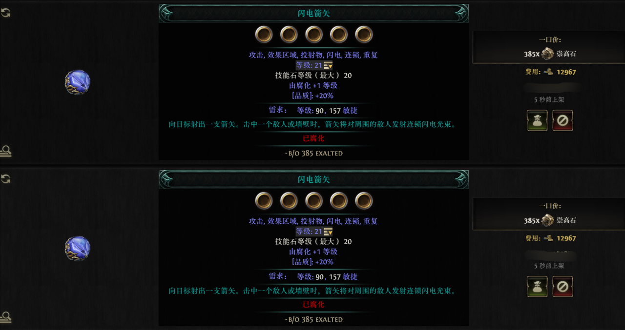 剩下狀態的話選已腐化,價格從低到高挨着看一下,說不定能撿到一些漏,像是銳眼這種體量,產出也是最大的。運氣好買到個沒滿級技能+1的滿孔的,再去用未切割的20級技能寶石覆蓋升級到20級,成本一般比直接買21級便宜不少,有耐心的小夥伴可以多找找。