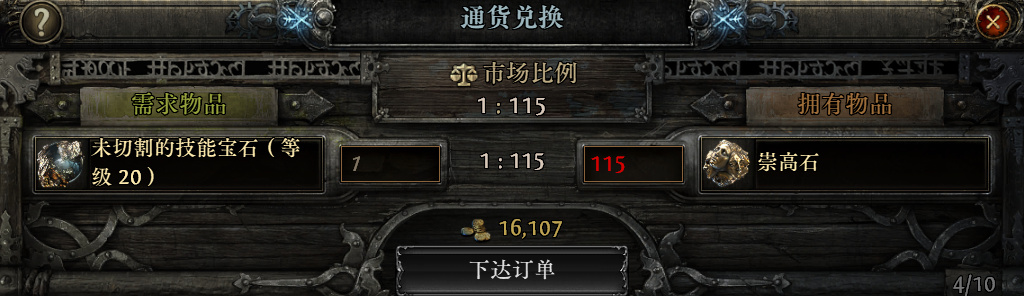 最後這一步非常簡單,直接購買一個等級爲20級的未切割的技能寶石,給剛纔+1技能的技能寶石升級即可,當時實時兌換比例是115E,不着急的話可以慢慢等,大概105E左右可以入手。加上上面的相當於製作成本就是115+44*X,這裏結合成品的價格大家代入失敗次數就可以計算出多少手能夠賺了。