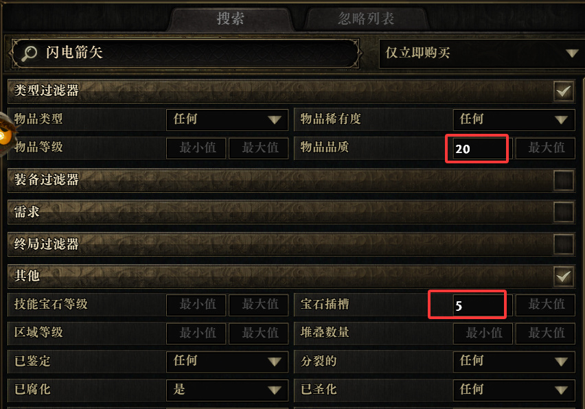 因爲瓦爾寶珠相當看臉,一次成的歐皇肯定是賺的,求穩其實可以在市集直接購買。給大家分享一下購買篩選步驟,輸入想要的技能名稱,物品品質要選20,寶石插槽一定要選五。