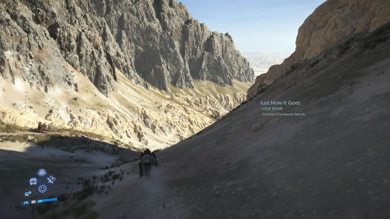 第一部直到静止的图变成动态(山姆骑摩托的远景),第二部直到从石头地面上推镜头到山姆的后背,似乎才真正变成游戏引擎的实时渲染。如果是真的话,这种障眼法真的太巧妙了,几乎骗过了所有人,尤其是信任游戏的人。