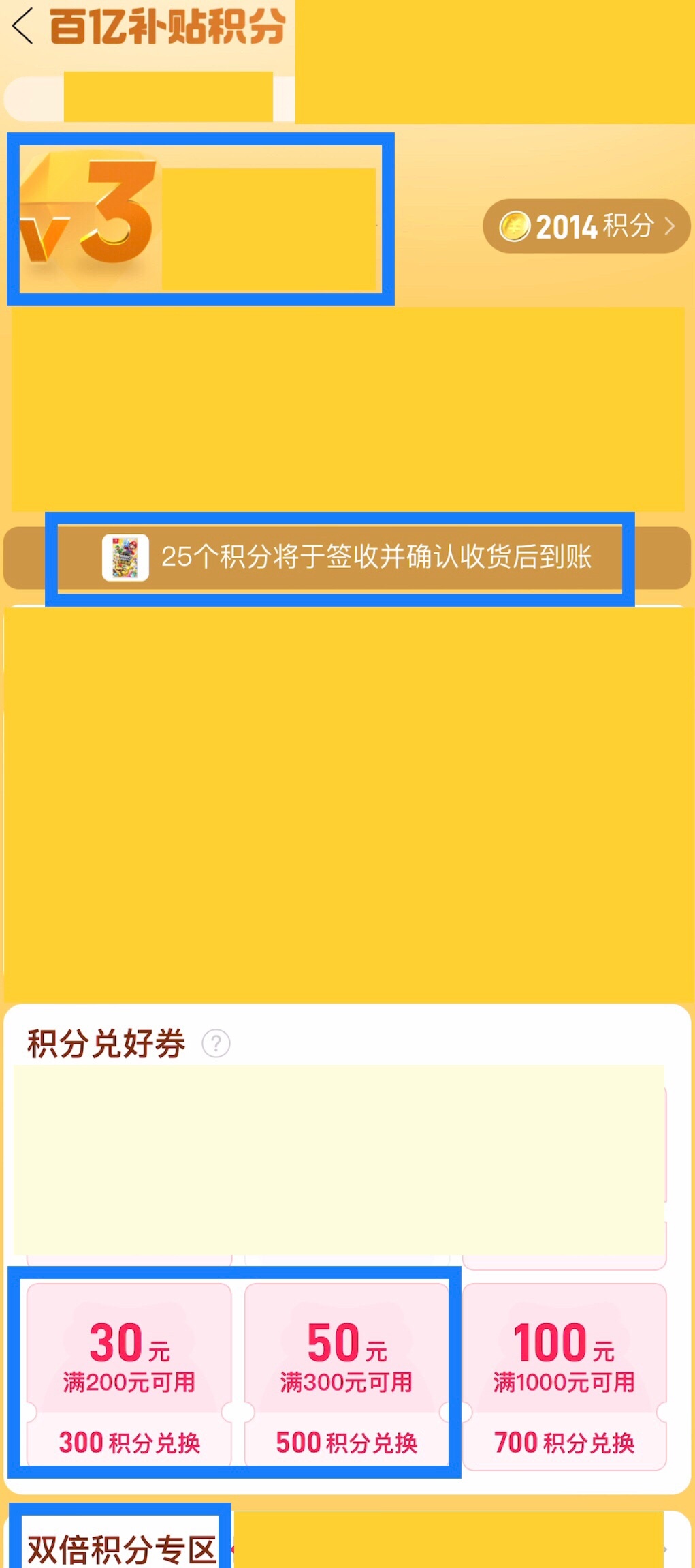 再說說v3減50券,點擊百億補貼頁面右上角積分,進入積分頁面。首先會看到一個等級,這個等級關係到你後面能領取的優惠券。等級的提升靠成長值。規則是買1塊錢的百億補貼東西給1成長值和積分,但電子產品特殊,電子產品是每10元給1成長值和積分,比如我買的空前盛會卡帶,200多塊只給25成長值。成長值是用來升會員等級的,積分是用來兌換券的。當本月消費後獲得成長值大於500,下個月即可成爲v3會員。v3是一個關鍵等級,因爲可以解鎖滿300減50的平臺優惠券,這個券可以在百億補貼價基礎上再減50,買遊戲卡帶非常划算。但需要注意,85折券和v3減50券都是平臺優惠券,這倆不可疊加。 如果不是v3,也可以兌換滿200減30的平臺優惠券。關於積分獲取,一方面買東西可以給積分,甚至有些東西給雙倍積分如下圖,另一方面,每日簽到可以免費獲得積分,每日簽到一週後可以領240積分,這是獲取積分最好的方式。