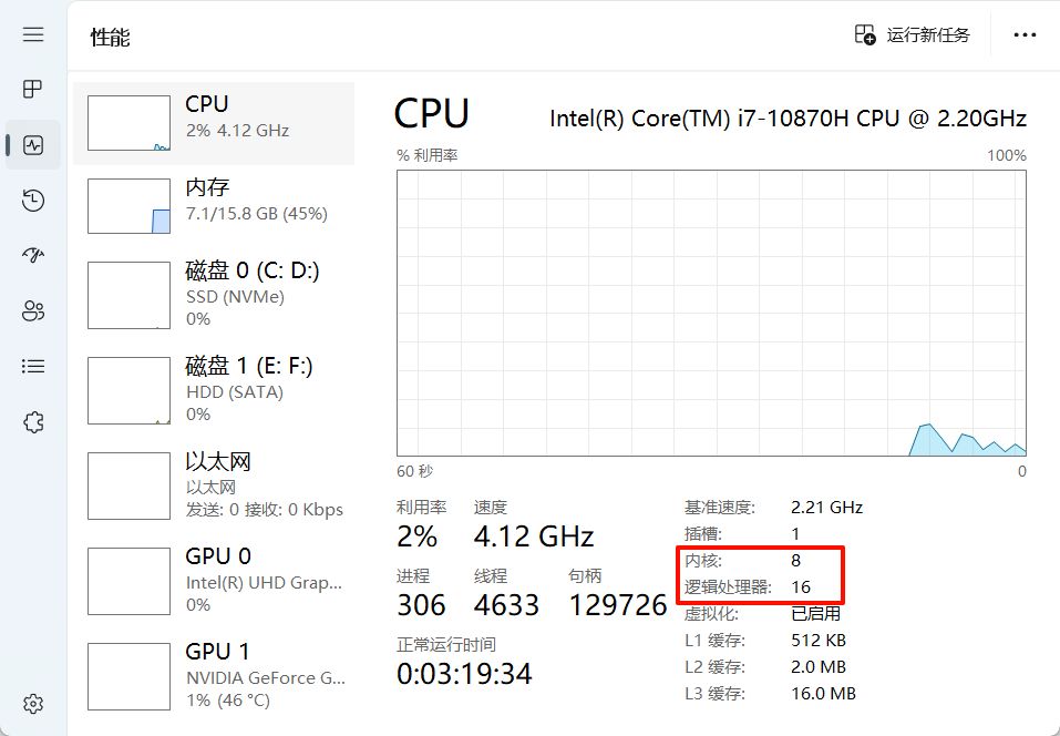 打开任务管理器——性能:查看内核、处理器