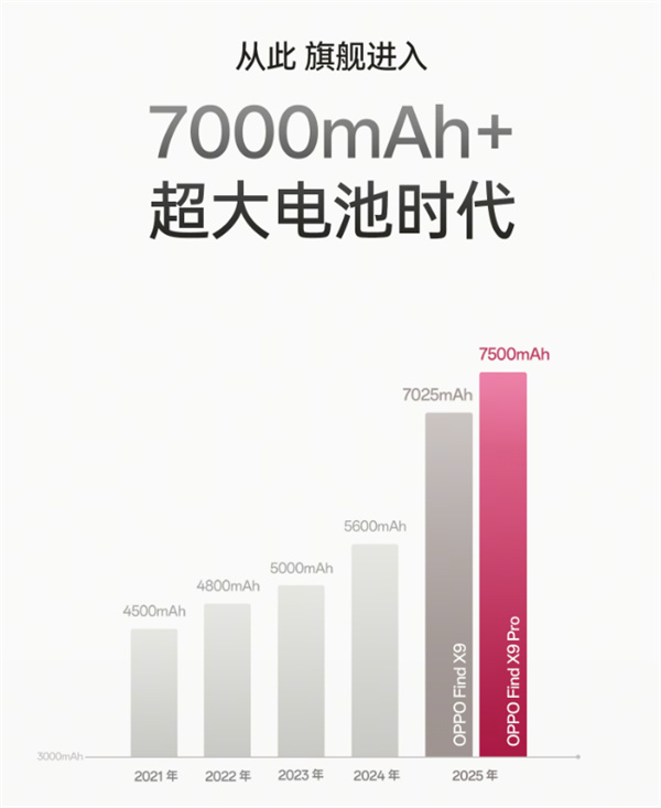 Find X9全系標配7000mAh+超大電池,其中,Find X9是7025mAh電池、Find X9 Pro則是7500mAh。