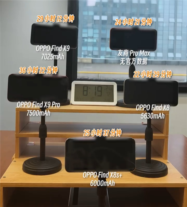 Find X9視頻播放總時長爲29小時12分鐘,Find X9 Pro視頻播放總時長達到了驚人的36小時22分鐘。