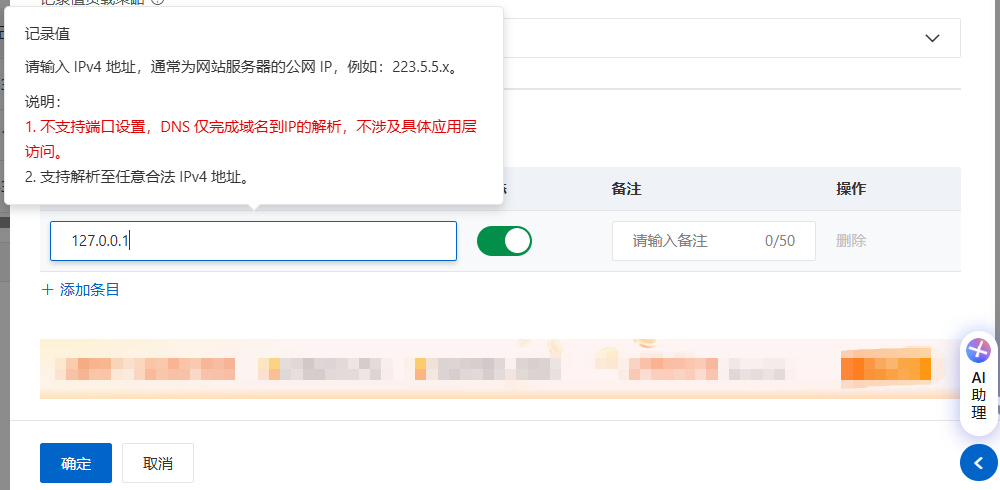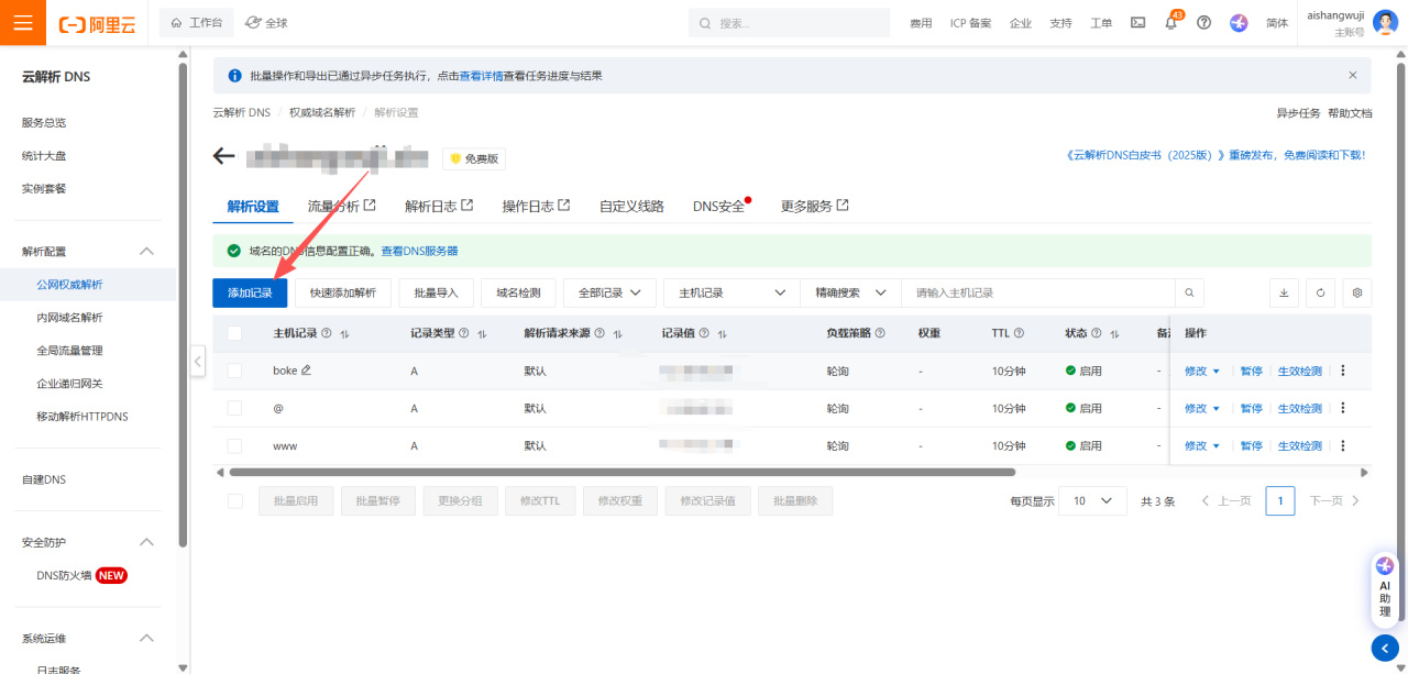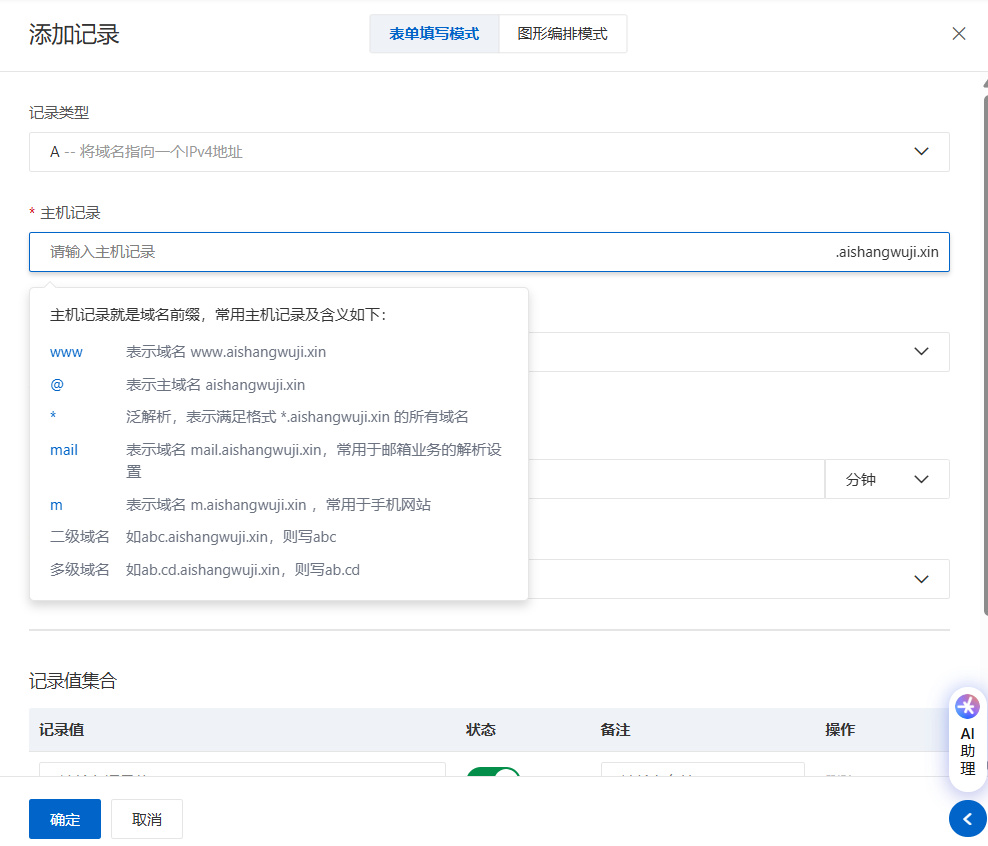 需要输入主机记录,即域名前缀,像我这个就是aishangwuji.xin是域名,www就是域名前缀。二级域名是可以根据自己意愿随意更改的。