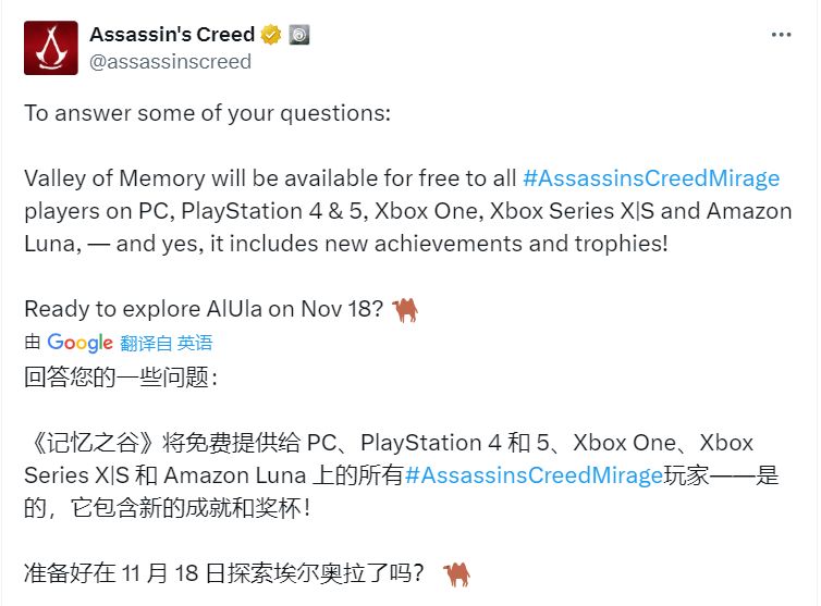 今天凌晨0点,育碧发文回复玩家提出的关于《刺客信条:幻景》DLC“回忆山谷”的相关问题。