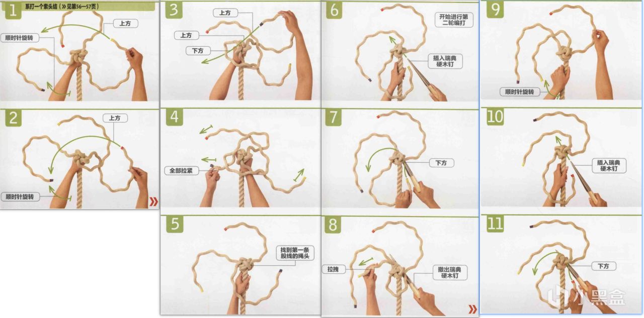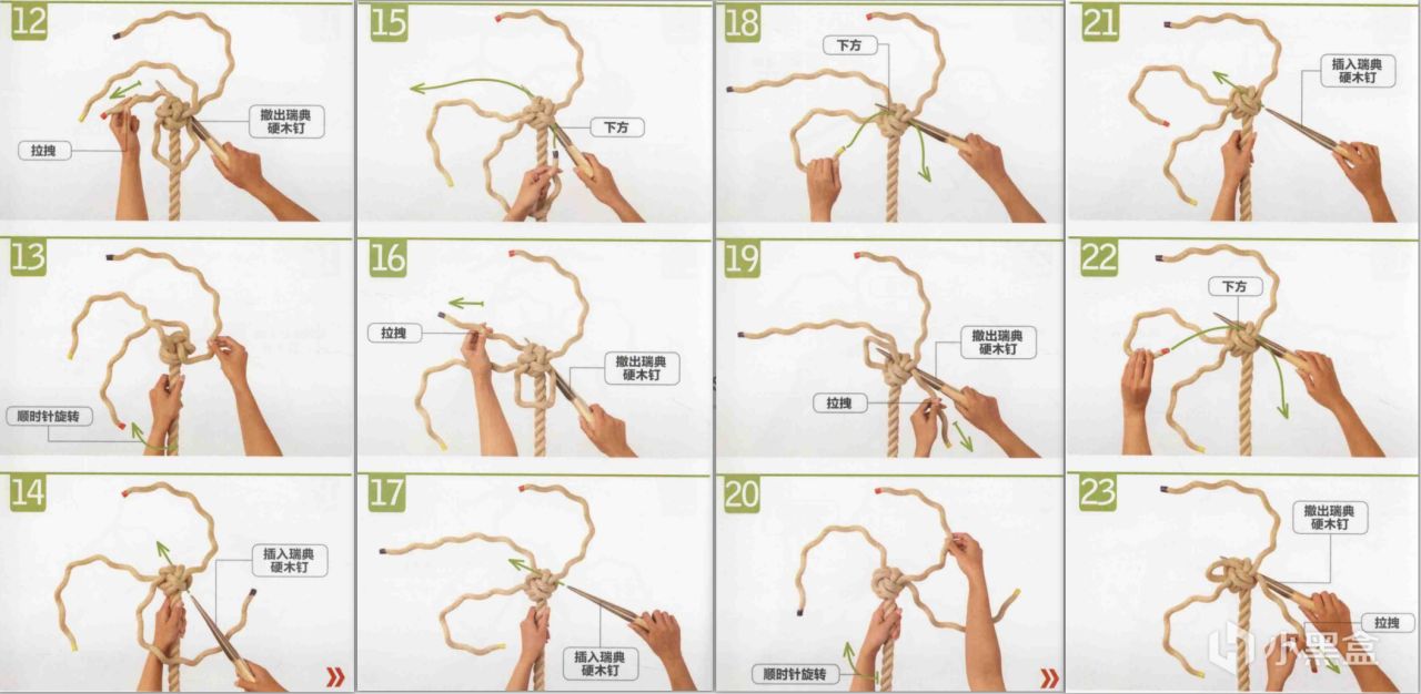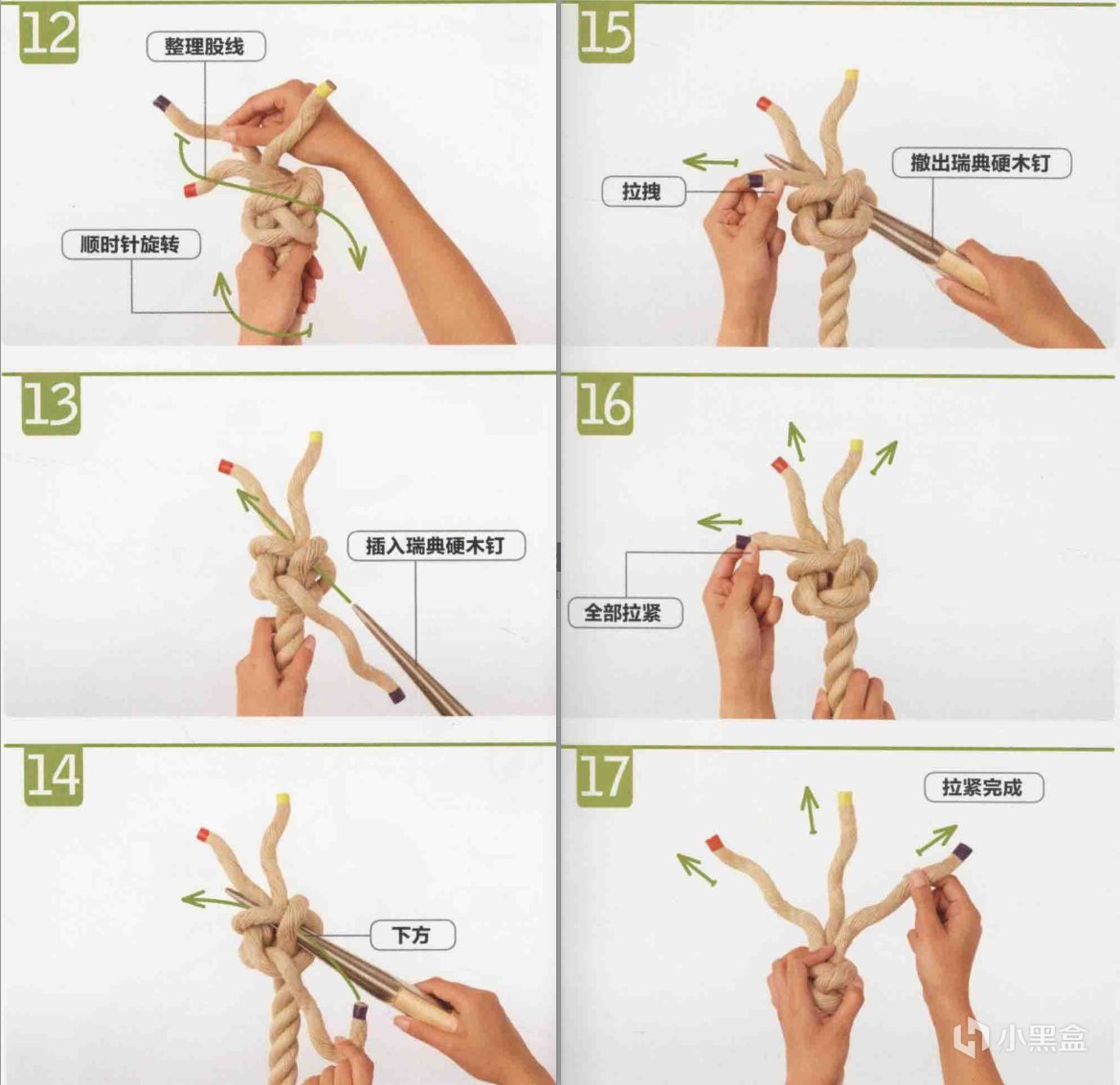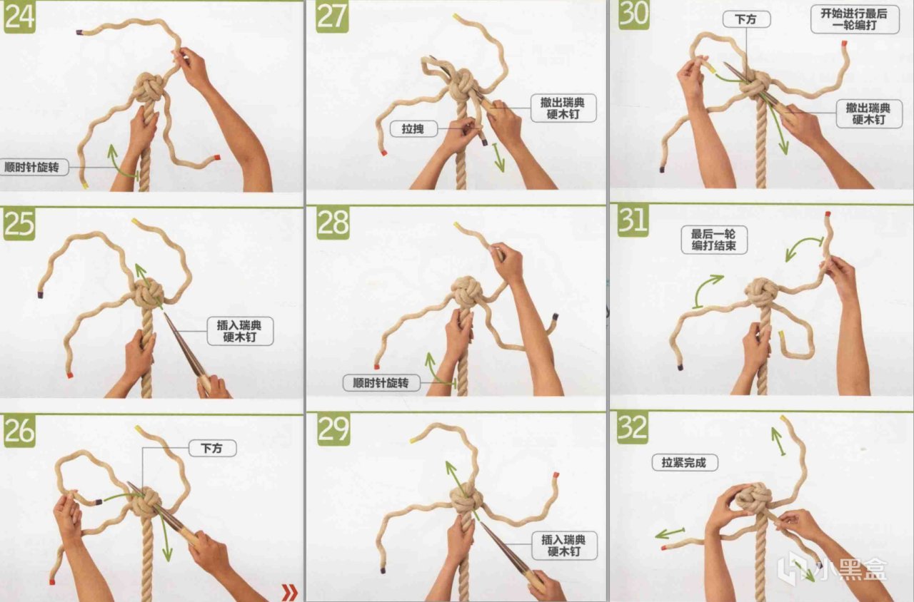为了便于股线间穿梭,可以借助硬木钉或瑞典硬木钉进行编打。