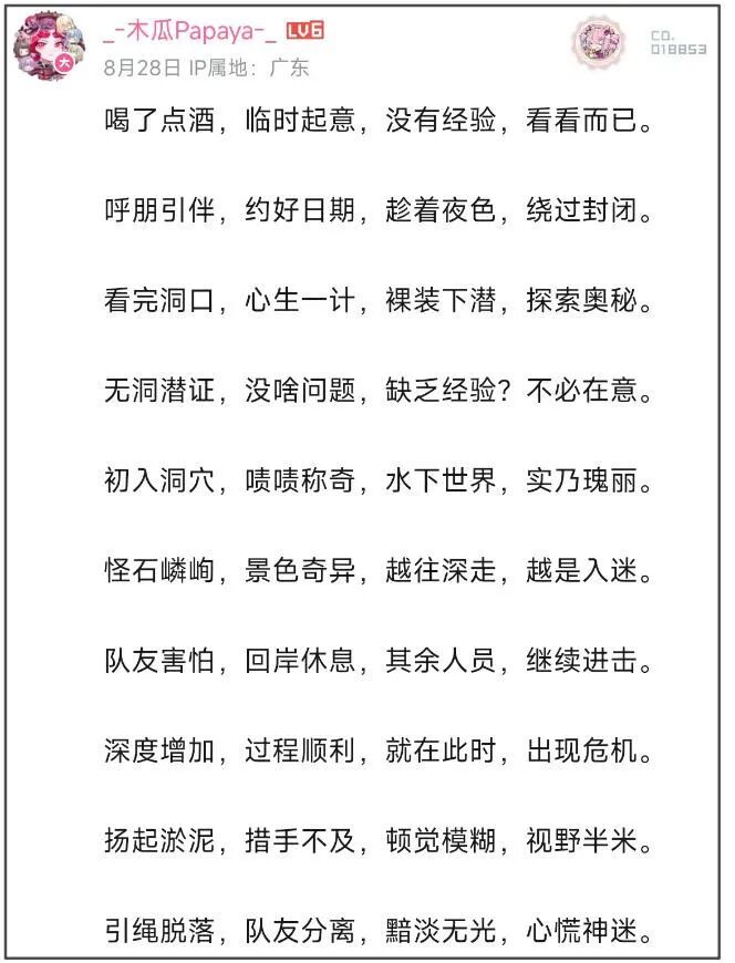 但不論如何,非專業人士,在麻痹大意的情況下從事這種活動,肯定都是在作死。許多探洞事故視頻的主角也正是這種人,以至於探洞視頻粉們還爲此編了首“作死打油詩”。很顯然,放假後最適合從事的運動,絕不可能是探洞或洞潛——