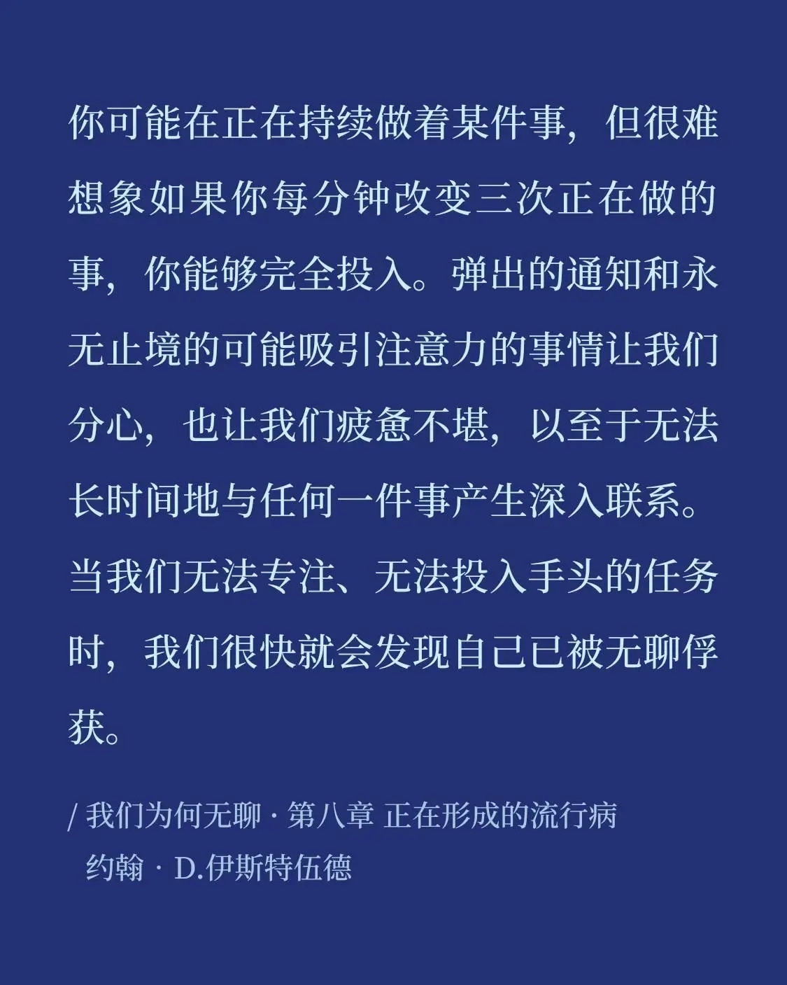 約翰.伊斯特伍德在解構現代人羣的信息焦慮時,說到如今人處於一種難以忍受的隱約且漫長的無聊,好似感染了一種“無聊傳染病”。由於精神刺激太多,意義卻很少,因而留下的最終還是無聊。處理攝入的信息是需要時間和精力的,同時我們的信息累積是如此之快,而意義的創造卻是無比緩慢的。因而在過量的信息灌入大腦之後,好像得了“慢性信息消化不良”,只會留下一陣空虛和落寞。然後照舊拿起手機去安撫這種懊悔情緒。