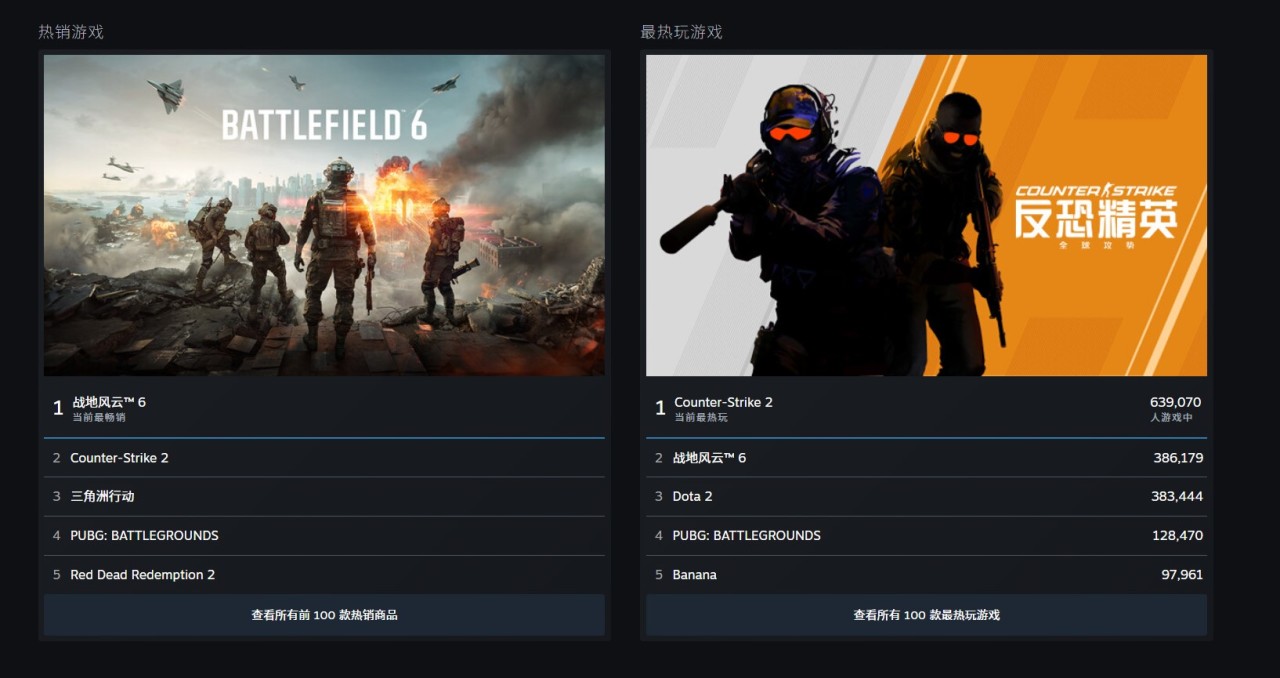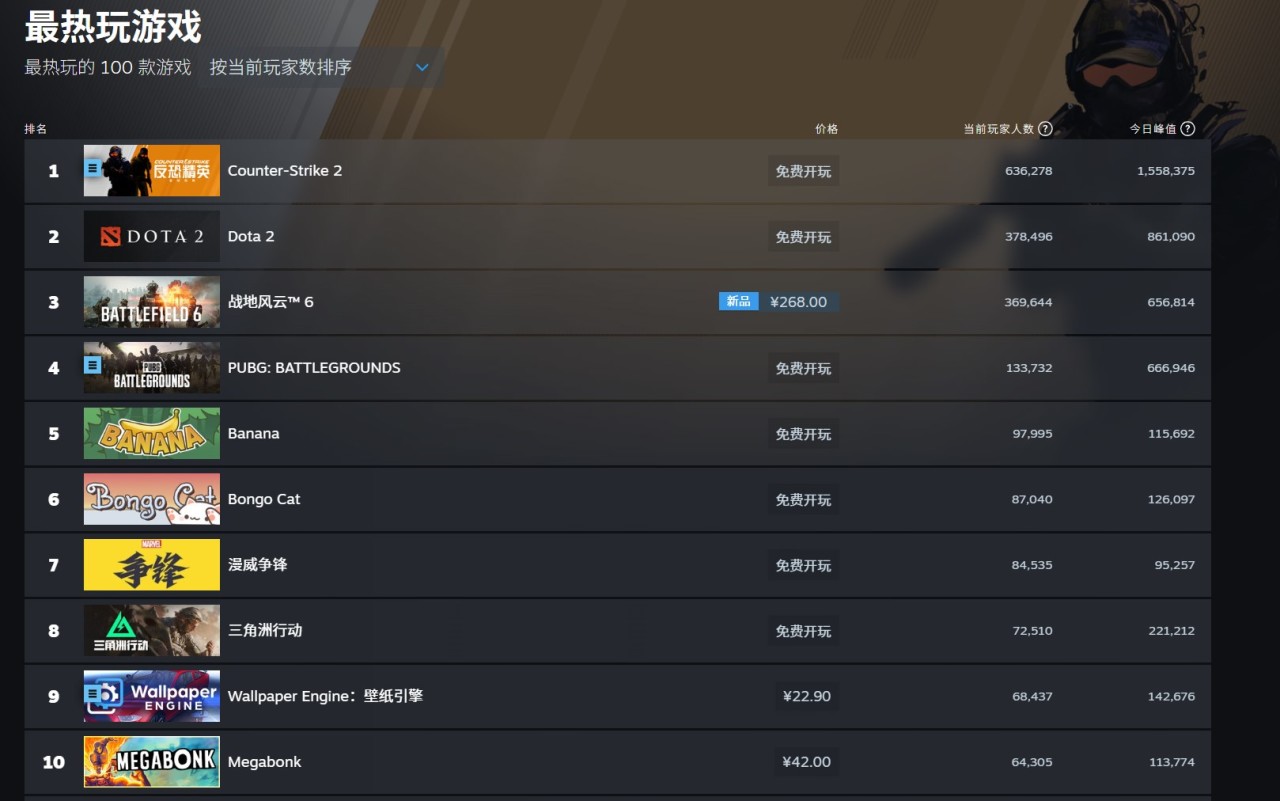 于10月10日正式发行的《战地风云6》发售在线峰值达74万人。